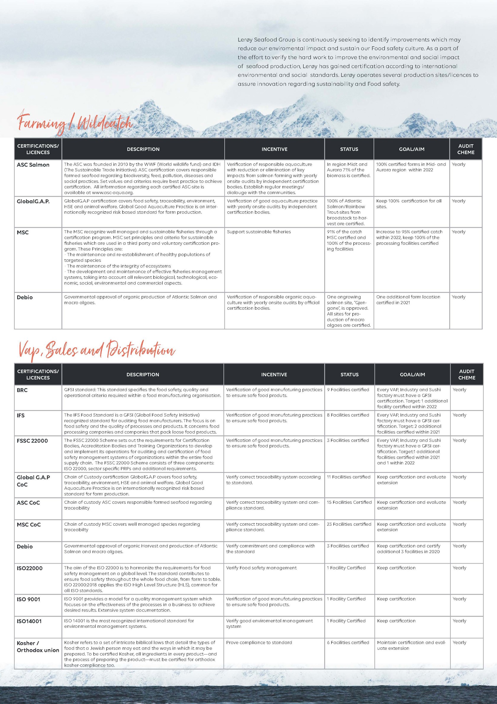 Lerøy Seafood Group is continuously seeking to identify improvements which may reduce our environmental impact and sustain our food safety culture. As a part of the effort to verify the hard work to improve the environmental and social impact of seafood production, Lerøy has gained certification according to international environmental and social standards.