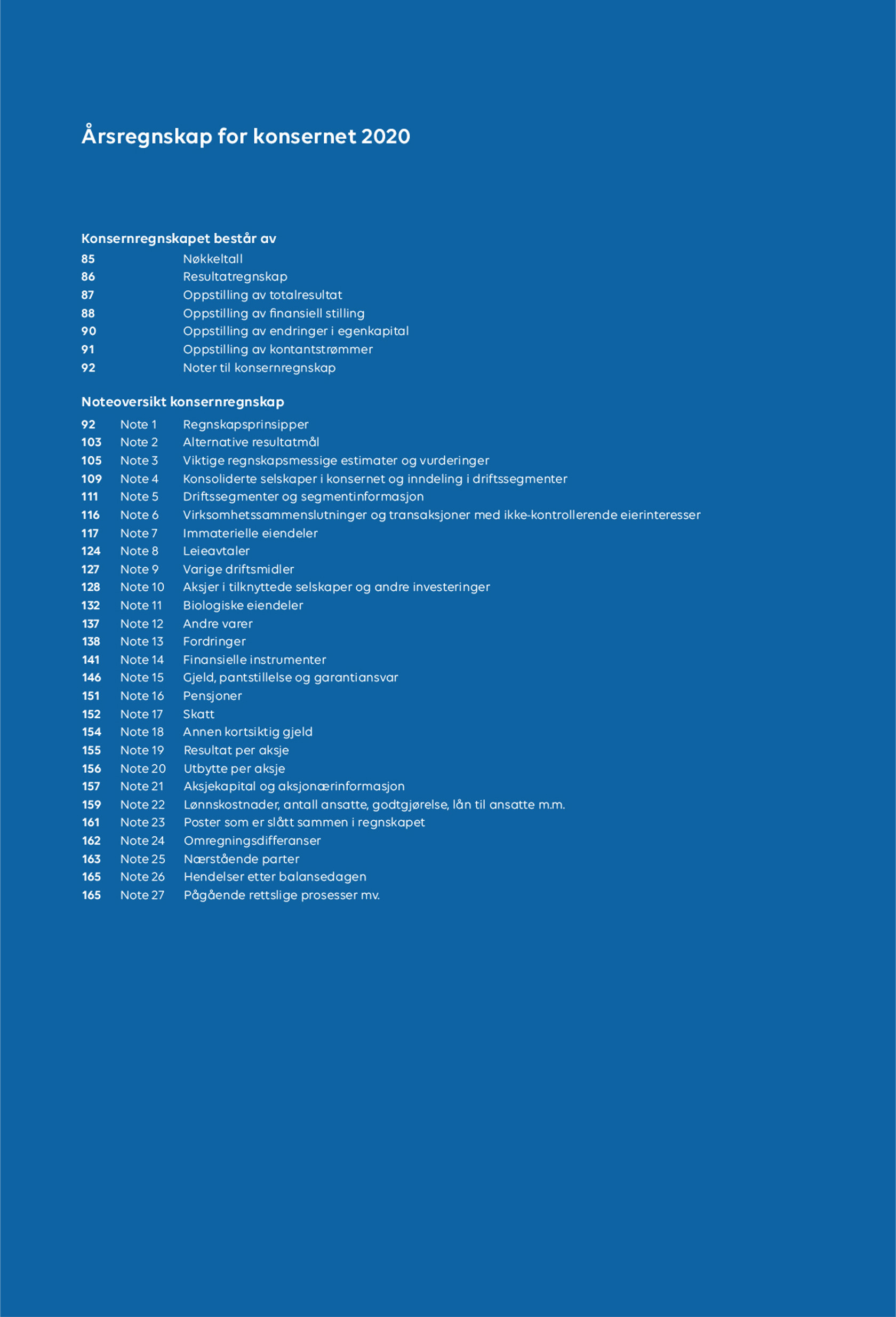 Resultat før skatt og før verdijusteringer knyttet til biologiske eiendeler ble i 2020 på 1 869 millioner kroner, mot 2 718 millioner kroner i 2019. Resultat per aksje, før verdijusteringer knyttet til biologiske eiendeler og minoriteter, var NOK 2,46 per aksje i 2020, sammenlignet med NOK 3,48 per aksje i 2019. Styret vil foreslå at den ordinære generalforsamlingen i 2021 vedtar et utbytte på kroner 2,0 per aksje.