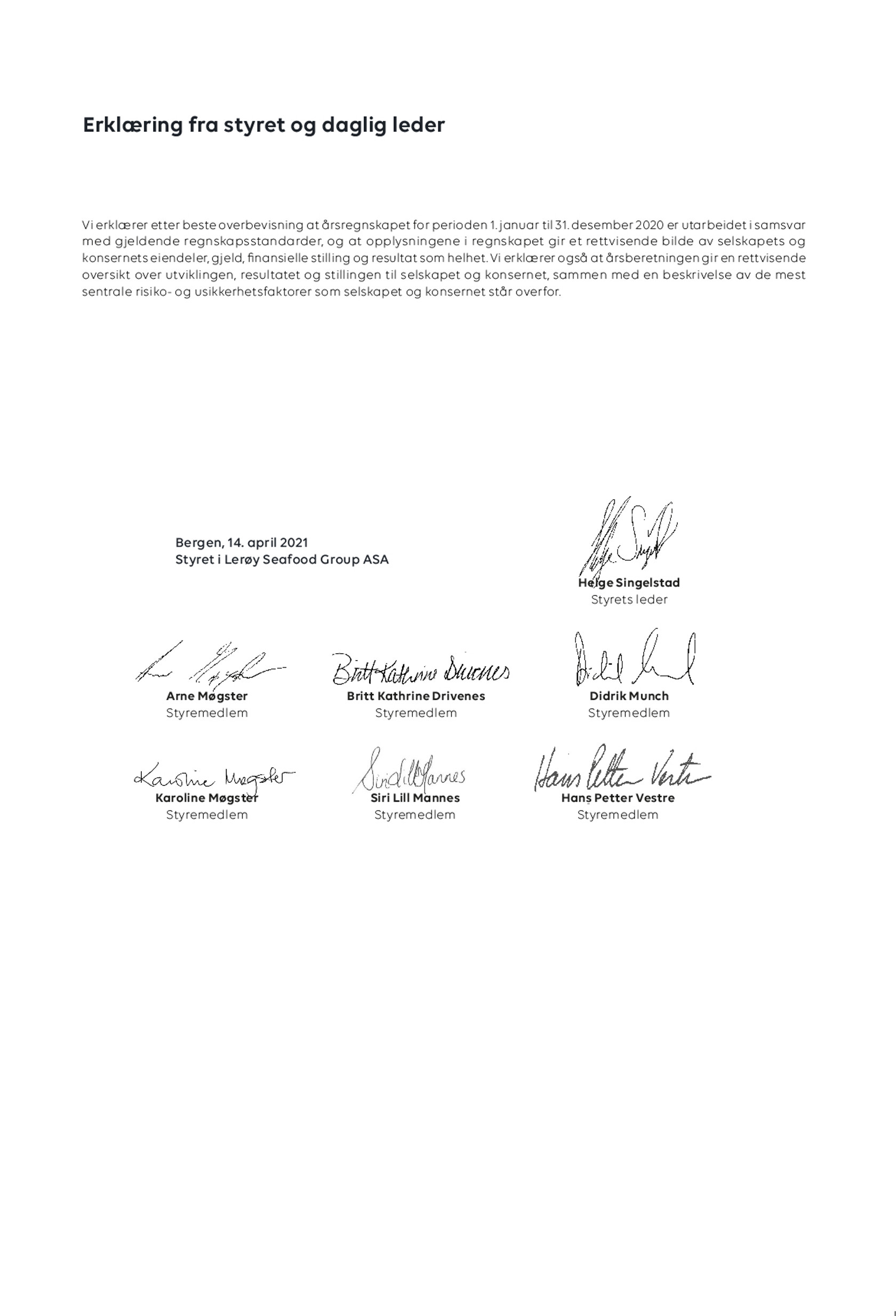 2020 var et spesielt krevende år, der restriksjoner knyttet til Covid-19-pandemien, krevde enorme endringer i arbeidshverdagen til konsernets medarbeidere. Med bakgrunn i konsernets posisjon i matvarekjeden er Lerøy Seafood Group definert som en samfunnskritisk virksomhet i Norge. Konsernets medarbeidere har gjennom gode systemer, god innsats og stor endringsvilje lykkes i å holde verdikjeden åpen.