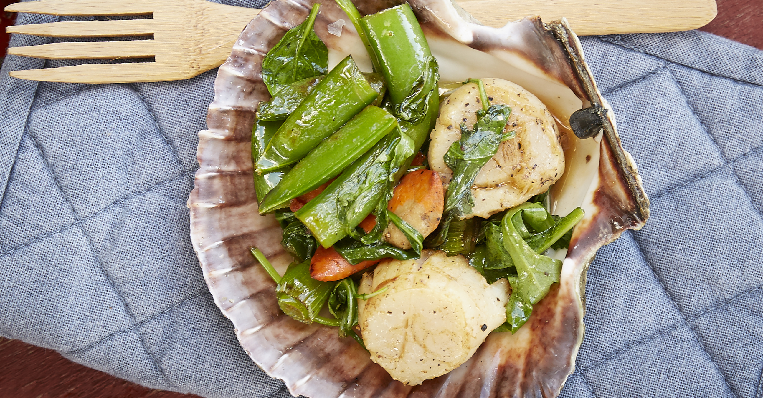 Kamskjellene stekes kun i 30-40 sekunder på hver side. Resultatet blir saftig og godt.