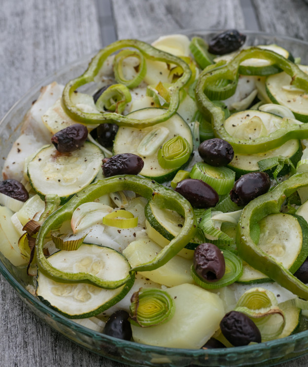 2. Form i ovn med torsk, squash, oliven og hvitløk som lages med kun ti ingredienser, er klar på 20 minutter – dette må være en av sommerens mest geniale retter!