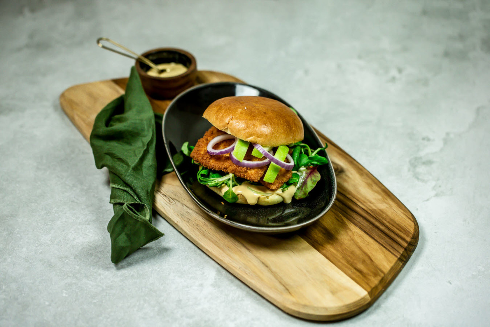 5. Smør burgerbrødene med chilimajones, og ha over spinatmiksen. Legg på fiskeburgeren, og server med couscous på siden.