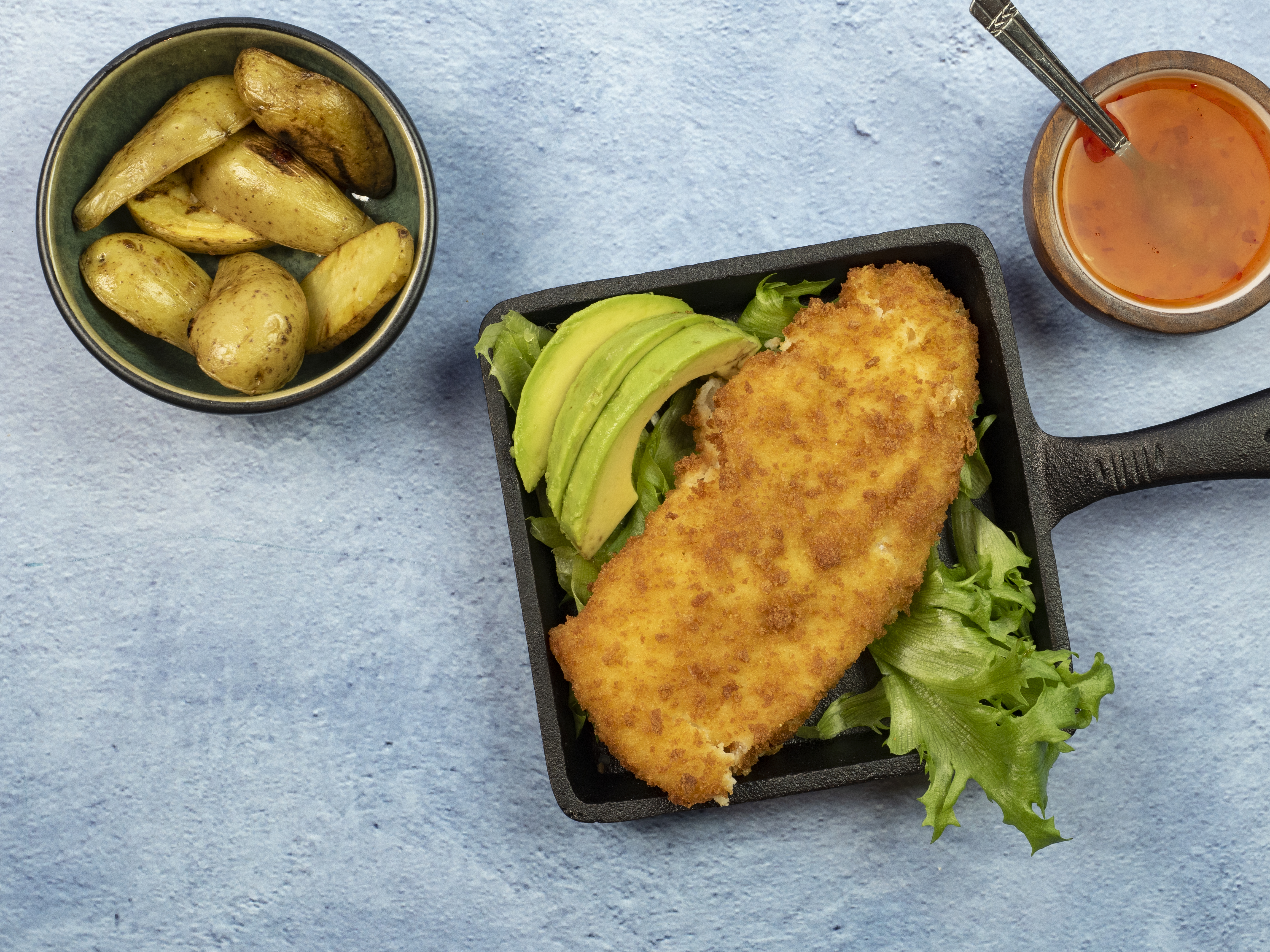 Panert torskefilet med avokado og potetbåter