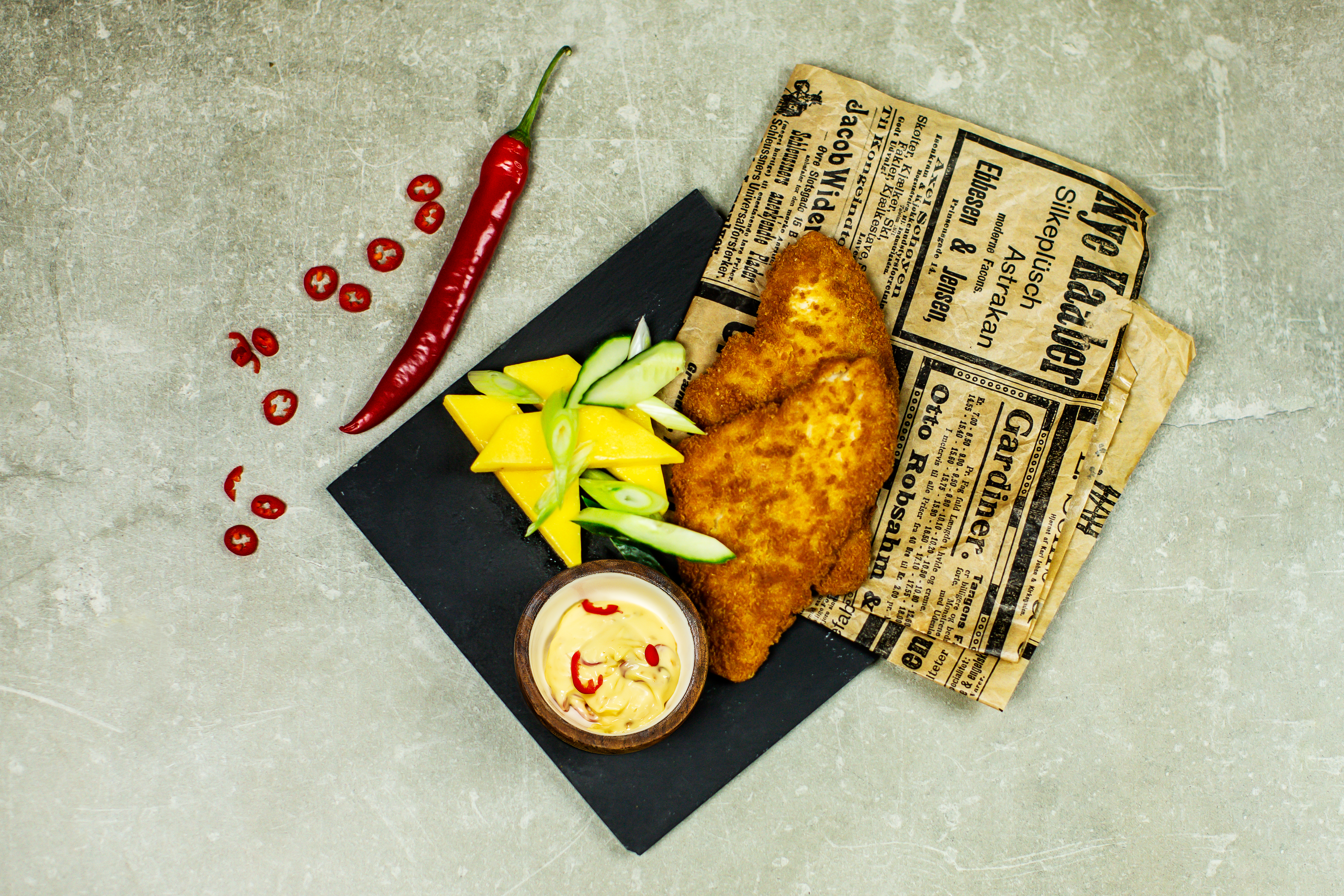 Panert rødspette med mangosalat og chilimajones