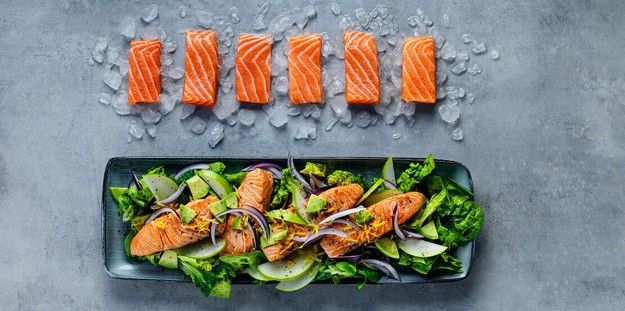 Fırında pişen somonlar, hazırlanan salatanın üzerine dizilerek sunuma hazır hale getirilir.